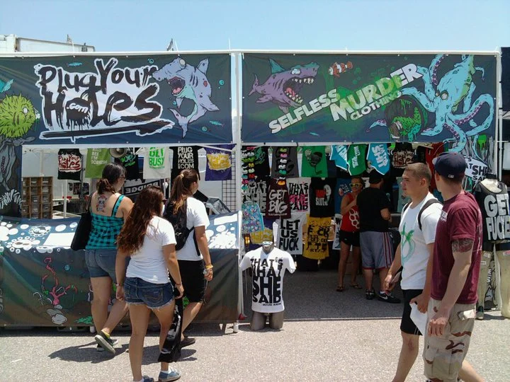 FIRST PICS FROM WARPED 2010! This is a design/illustration collaborative project I did with Sam Dean of Plugyourholes.com & Joe Murder of Selfless Murder Clothing. We made Tents, Banners, Tees, Merch, Flyers, Drop Cards, the whole shi-bang. More pics to come :)