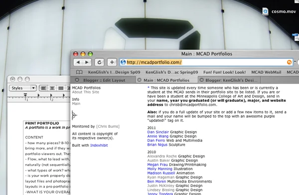 For those of you who don’t already know about “this site made by MCAD graduate Chris Burns, who felt there was a hole that needed to be filled”…it’s a database of MCAD student websites (and some faculty now too!) organized by graduating class. Check it out! And don’t forget to request to have your site listed once you’re ready to launch.