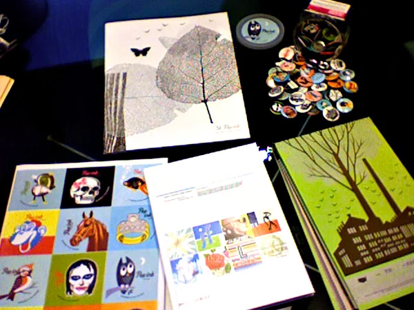 I also left with a bunch of FREE swag! Below are a bunch of buttons, a full CSA Portfolio Book,a freshly printed French Paper product guide, a POPink product guide, and a sheet of POPink stickers! (sorry for the bad quality photo)